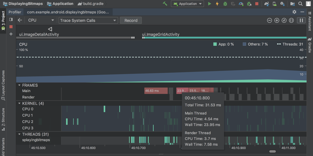 In the CPU Profiler, you can now inspect how long it takes your Java app to render each frame on the main UI thread and RenderThread. This data might be useful when investigating bottlenecks that cause UI jank and low framerates. For example, each frame that takes longer than the 16ms required to maintain a smooth framerate is displayed in red.