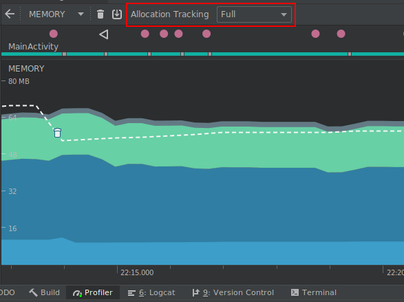 To improve app performance while profiling, the Memory Profiler now samples memory allocations periodically by default. If desired, you can change this behavior by using the Allocation Tracking dropdown when testing on devices running Android 8.0 (API level 26) or higher.