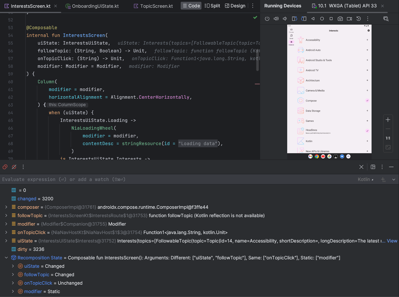 When parts of your Compose UI recompose unexpectedly, it's sometimes difficult to understand why. Now, when setting a breakpoint on a composable function, the debugger lists the parameters of the composable and their state, so you can more easily identify what changes might have caused the recomposition. For example, when you pause on a composable, the debugger can tell you exactly which parameters have "Changed" or have remained "Unchanged", so you can more efficiently investigate the cause of the recomposition.