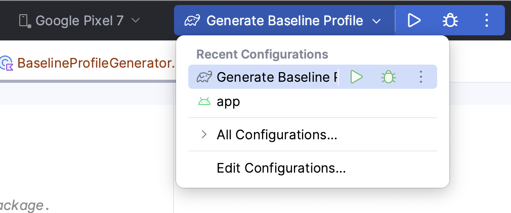 The template also creates a run configuration that lets you generate a Baseline Profile with one click from the Select Run/Debug Configuration drop-down list.