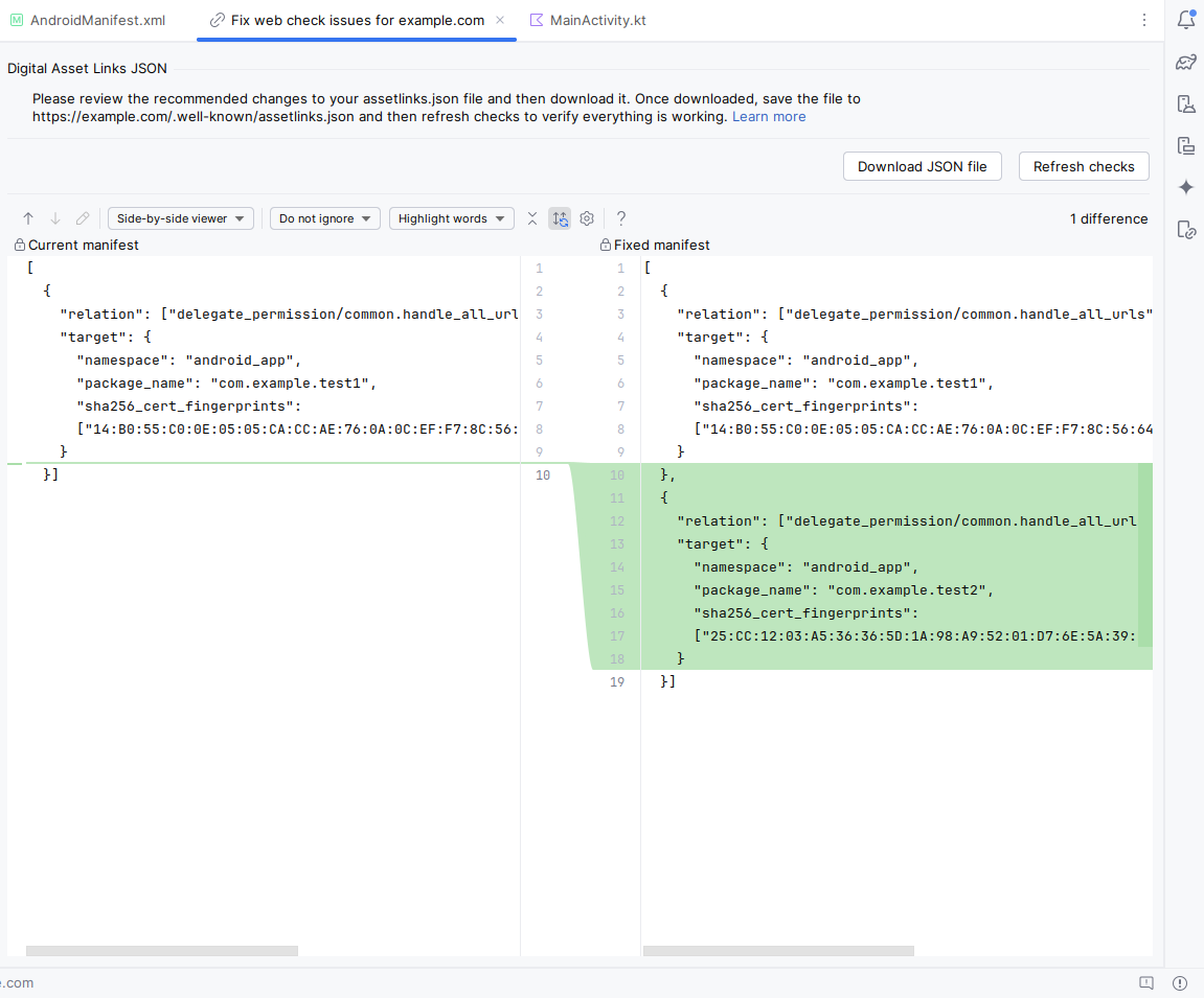 To implement App Links, developers need to publish a Digital Asset Links JSON file on their websites to verify ownership of the domain. When the App Links Assistant identifies failed web checks, it now creates a JSON file which can fix those failures. This JSON file can be downloaded by the user and subsequently uploaded to the respective website to resolve the web check failures.