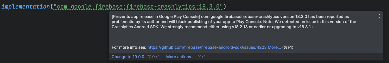 Android Studio now also displays notes from SDK authors directly in the editor to save you time. When a recommended version or version range is available, Android Studio will also include a quick fix:
