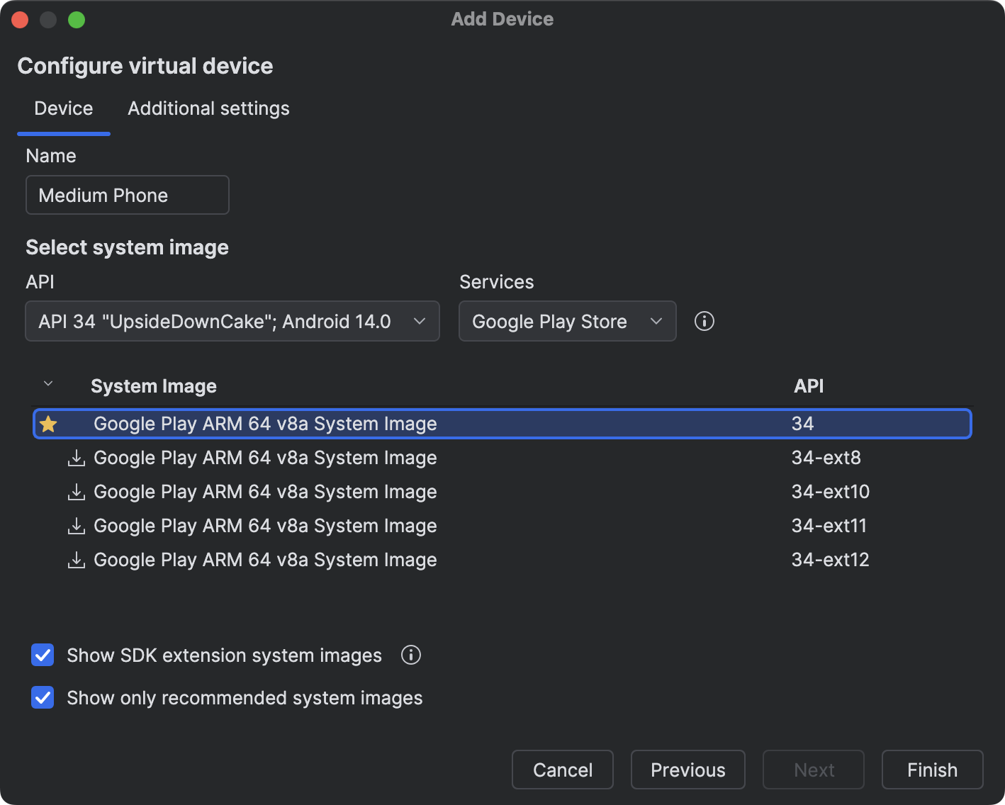 When creating a new virtual device, new filters and recommendations make it easier to create a device configuration that fits your needs and performs the best on your workstation.