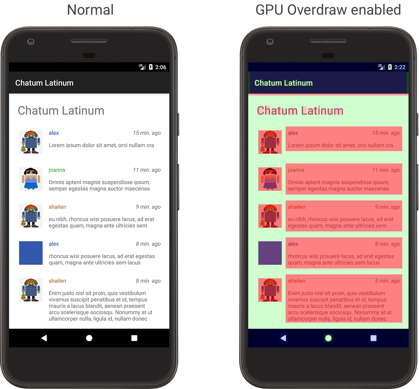 Figure 3. Examples of an app with lots of overdraw (left) and much less overdraw (right)
