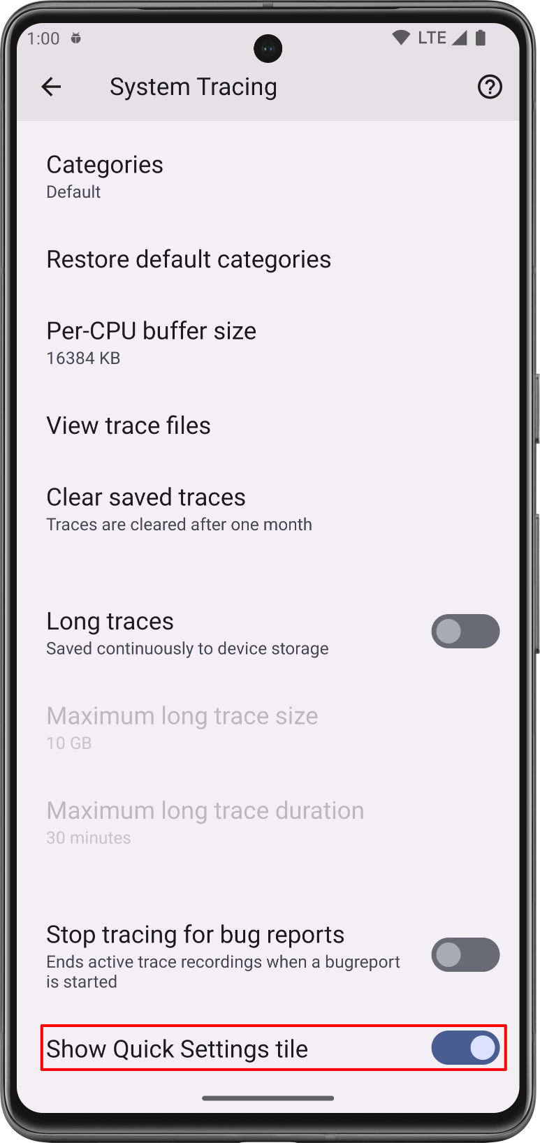 Figure 1. The Show Quick Settings tile switch in the System Tracing app.