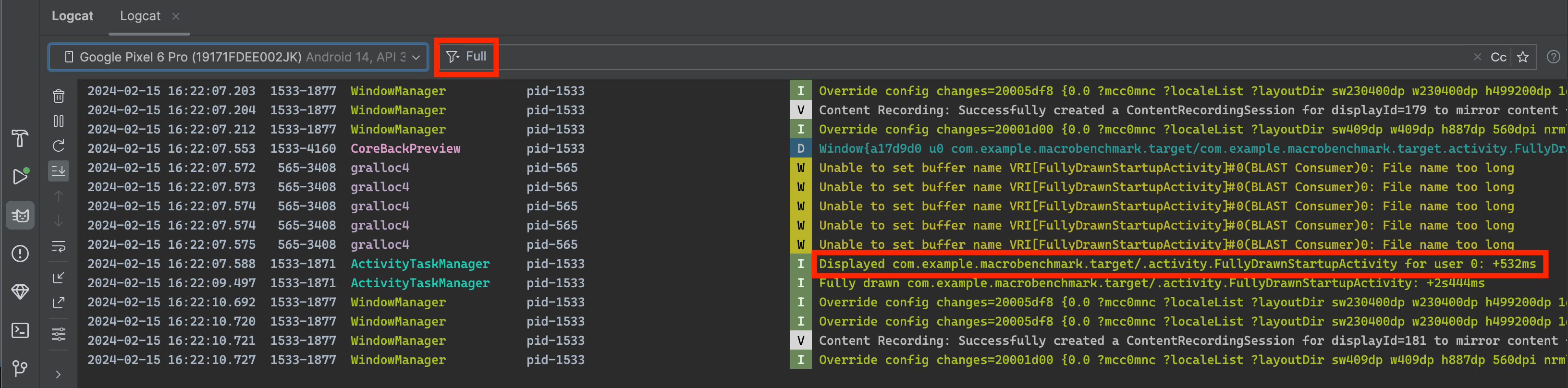 We recommend using Logcat in Android Studio, but If you're not using Android Studio, you can also measure TTID by running your app with the adb shell activity manager command. Here's an example: