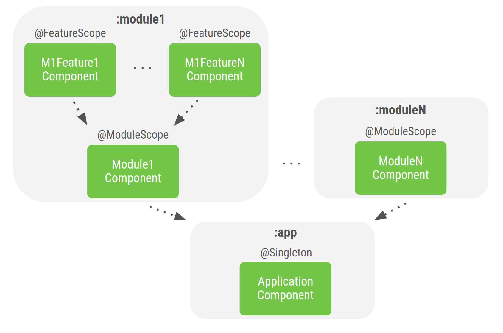 ApplicationComponentshould always be in theappmodule.Create Dagger components in modules if you need to perform field injection in that module or you need to scope objects for a specific flow of your application.