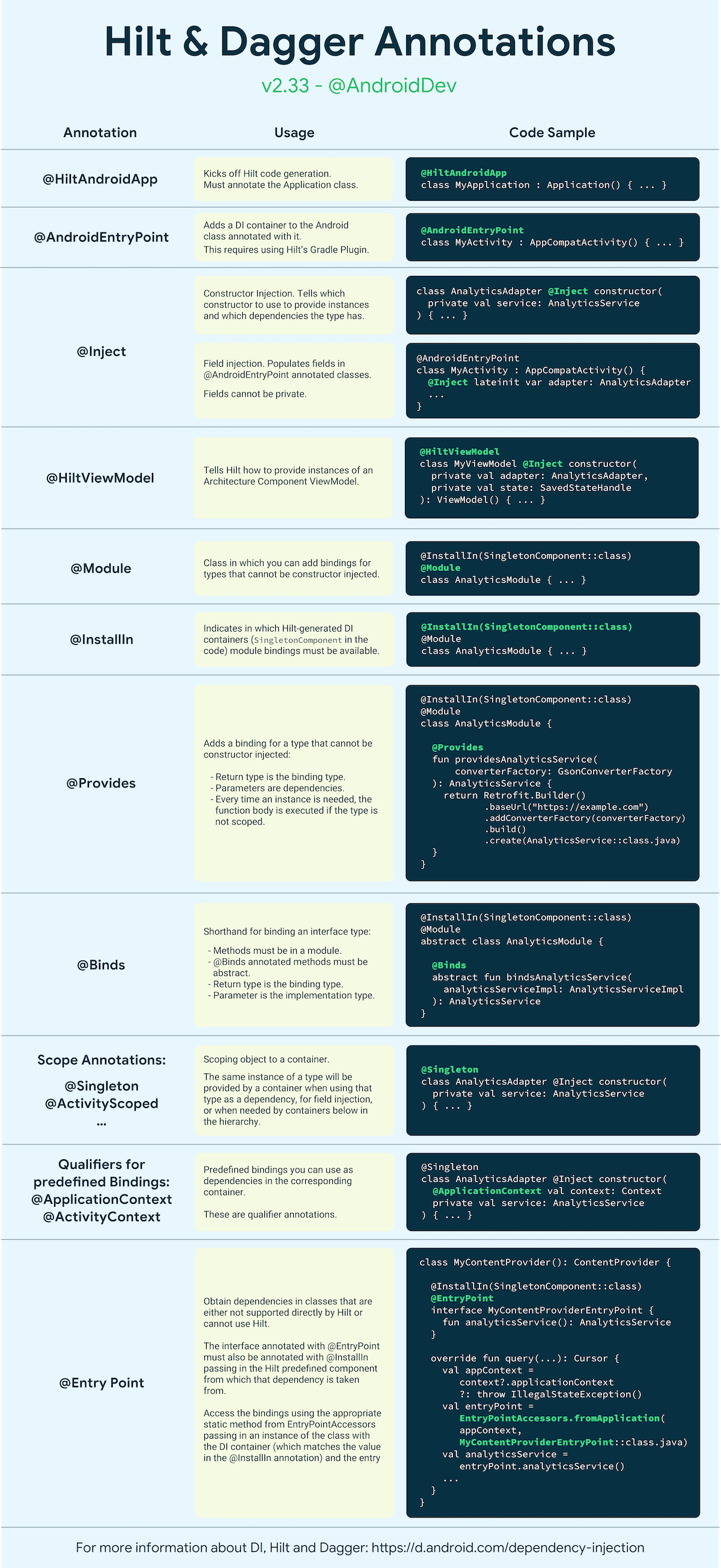 This cheat sheet allows you to quickly see what the different Hilt and Dagger annotations do and how to use them. The cheat sheet is also downloadable in PDF format.
