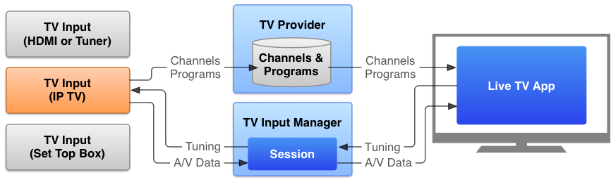 The framework lets developers define live TV input sources by implementing a TV input service. This service publishes a list of channels and programs to the TV Provider. The live TV app on a TV device gets the list of available channels and programs from the TV Provider and displays them to a user.
