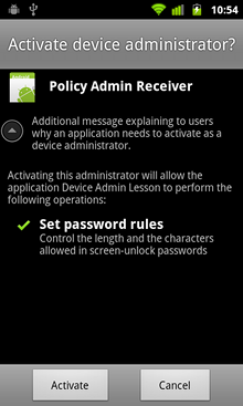 If the user chooses "Activate," the application becomes a device administrator and can begin configuring and enforcing the policy.